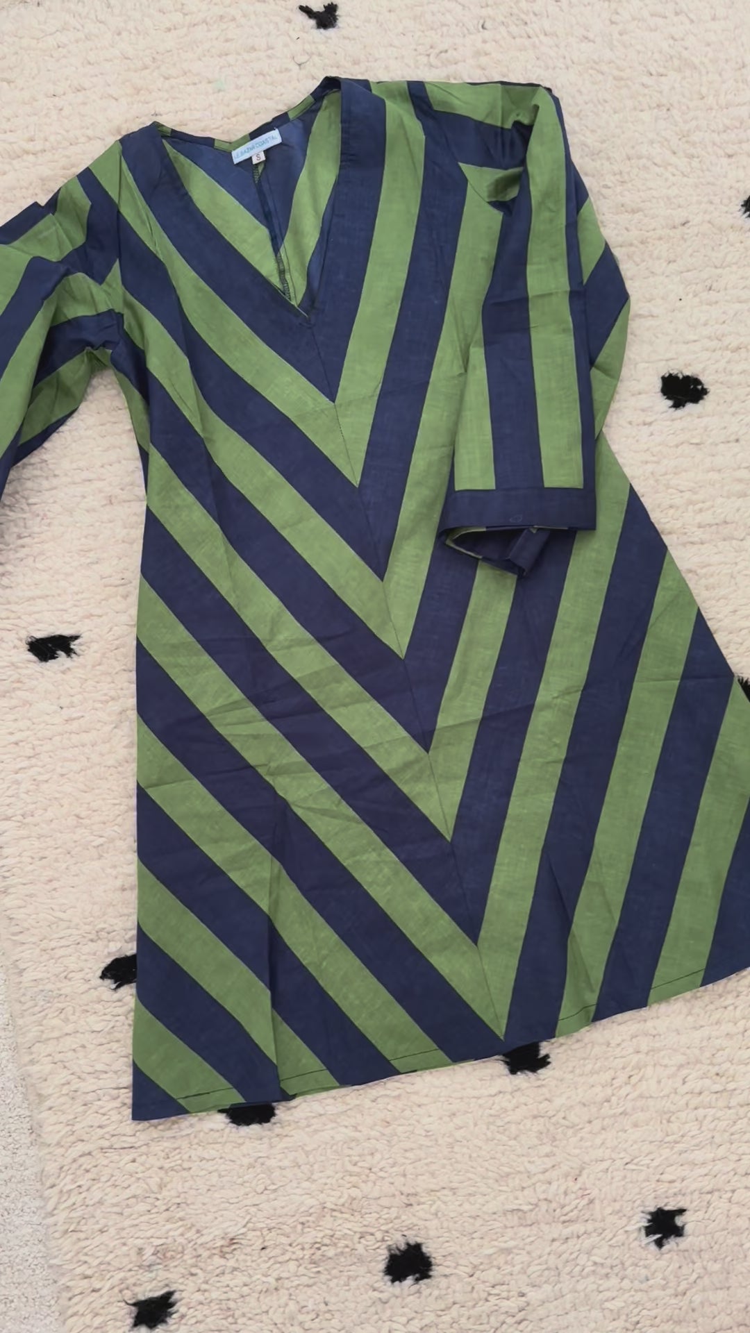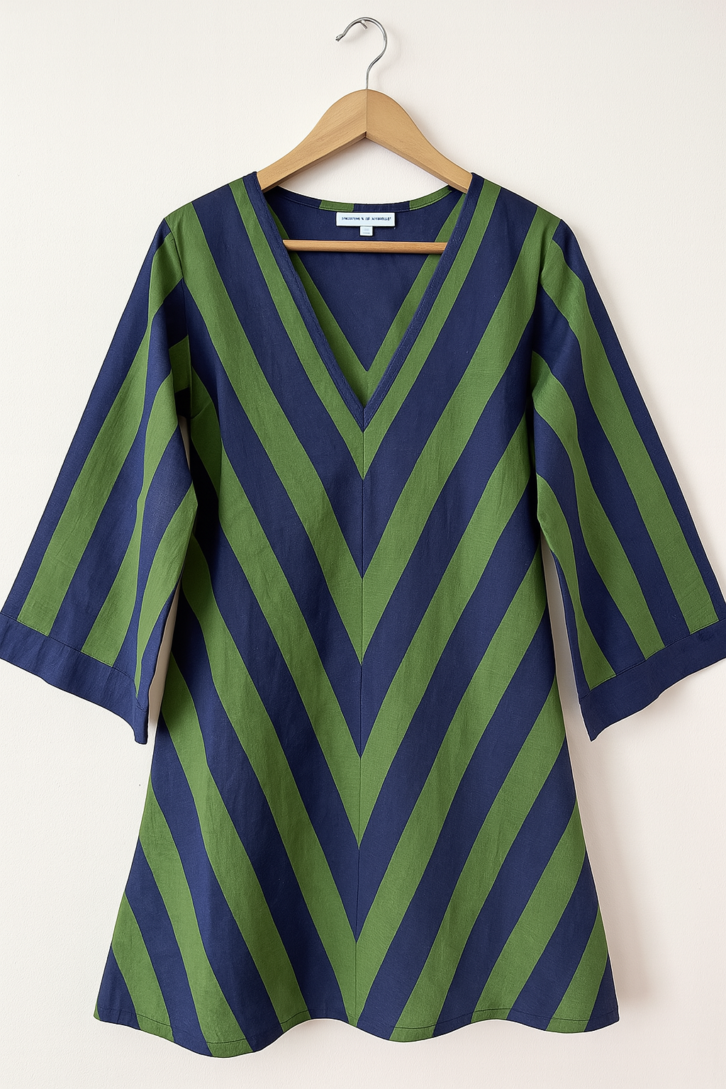 This playful mini dress features a bold chevron pattern in deep navy blue and jewel tone green, perfectly paired with bell-shaped sleeves that end just above the wrist. Its flattering A-line cut and V-neck highlight the incredible tailoring of soft, 100% cotton fabric, making it effortlessly chic for any day or night.